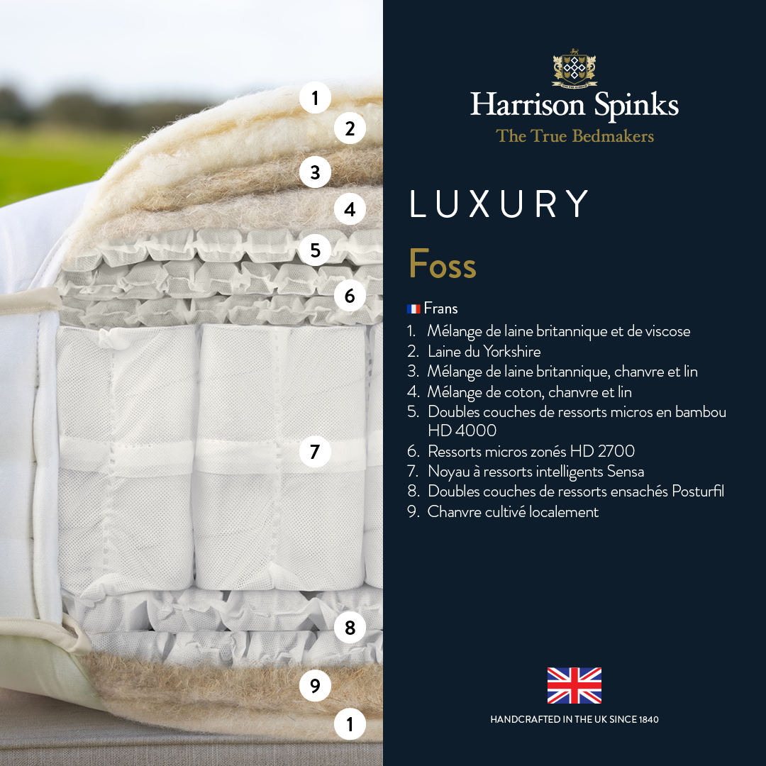 While Harrison Spinks looks to the past for its materials, it looks to the future for its technology. As inventors of revolutionary spring systems, they incorporate HD Micro Springs. These precision springs, assembled without any glue to guarantee the mattress’s recyclability, offer point-by-point support that adapts to every body shape with rare subtlety.